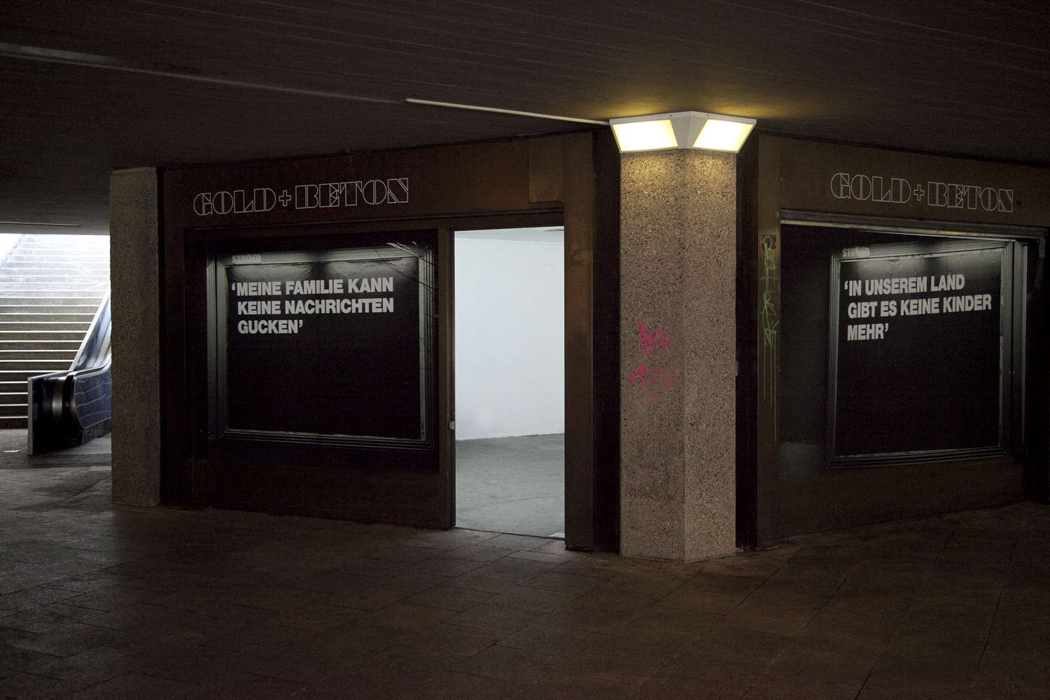 “Vera Drebusch brings the words of Syrian refugee children to public space with large-scale posters. Their statements ‘IN OUR LAND THERE ARE NO CHILDREN ANYMORE’ and ‘MY FAMILY CANNOT WATCH NEWS’ are ambiguous, due to the constraints of translating from a foreign language. Are there no children anymore because they all fled? Or are there no more children because all children have had to grow up due to these experiences? Are all televisions destroyed? Or is the news on TV simply unbearable for the affected families?”