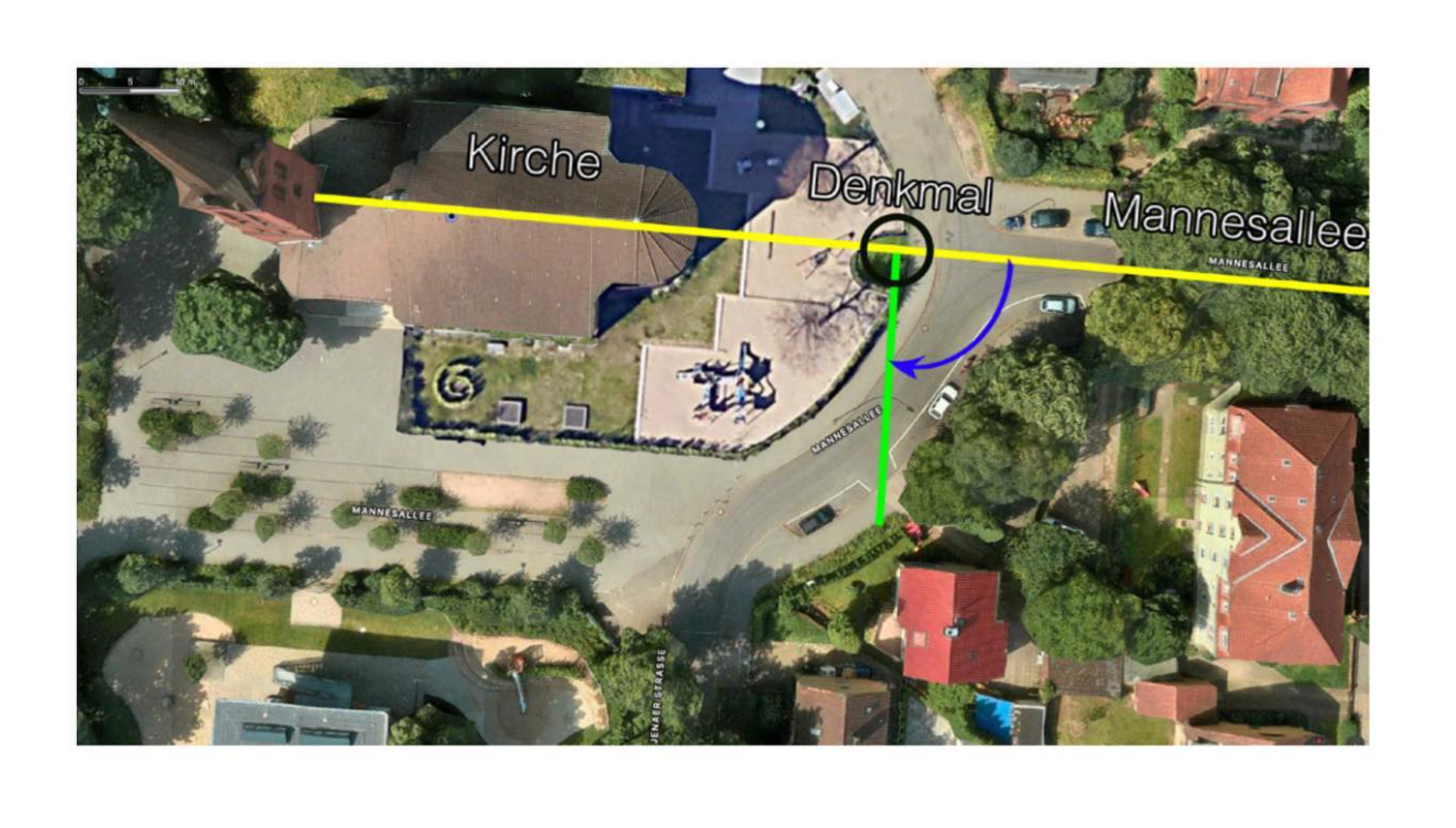 „Drehung des Denkmalsteins in Richtung der Stolpersteine, die auf dem Bürgersteig der Mannesallee für Familie Leipelt (Widerstand der Weißen Rose) schon 2002 verlegt wurden. Die Betrachtenden werden so mit den Opfern jenes Systems, dem die Inschrift des Kriegerdenkmals den Boden bereitete, konfrontiert. Gleichzeitig wird die Verbindung mit bereits vorhandenen Erinnerungsmalen für den Widerstand hergestellt. Eine vergleichbare räumliche Nähe zwischen einem Kriegerdenkmal und Stolpersteinen ist in Deutschland sicher selten gegeben.”