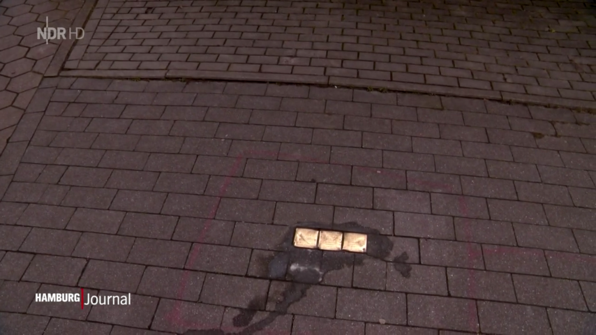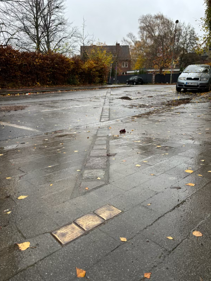 Dritter Schritt: Stein-Linie gepflastert in dem Boden der Gehwege und Straße zwischen Denkmal und Stolpersteinen.