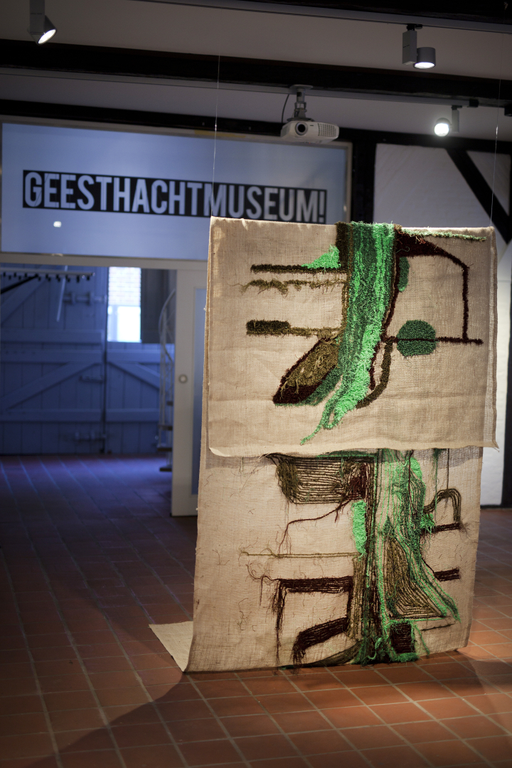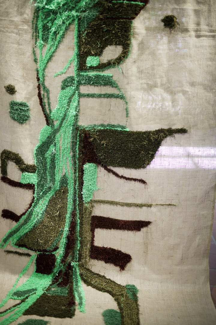 Für ihre beiden Textilarbeiten haben die Künstlerinnen ihren Blick auf das „Grüne Band“ gerichtet. Dieses erstreckt sich entlang des einstigen Todesstreifens zwischen den Grenzanlagen im Osten und der innerdeutschen Grenze. Mit einer Breite von 50 bis 200 Metern bot es schon während der Ost-Westteilung Raum für eine beinahe ungestörte Entwicklung der Natur. Nach dem Mauerfall wurden große Teile zu Naturschutzgebieten umgewandelt. Die vier Meter lange getuftete Arbeit ist einem Ausschnitt dieses Streifens nachempfunden. Dabei dienten Luftaufnahmen als Vorlage für das abstrakte Muster aus farbiger Wolle. Auf diese Weise machen die Künstlerinnen deutlich, dass die Grenze keine harte, unbewegliche Linie ist, sondern einen diffusen, weichen Charakter hat.