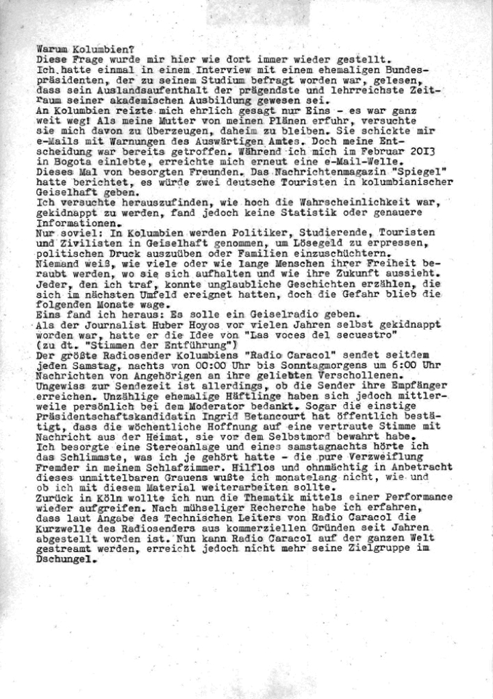 “In ihrer Zeit in Bogota stößt Drebusch auch auf das Radioprogramm “Las voces del secuestro” (zu dt.”Stimmen der Entführung”), das jeden Sonntag Nacht zwischen 0:00 und 6:00 Nachrichten von Angehörigen entführter Menschen sendet, in der Hoffnung, die Entführungsopfer würden diese an ihren unbekannten Aufenthaltsorten zu hören bekommen. In der Installation “Geisel-Radio”, die aus einem mit roten Adern gemaserten Marmor Gedenkstein (Levanto Rosso) und einer Sound/Sender-Installation besteht, erzählt die Künstlerin von diesem “Geisel-Radio” und davon, wie es dazu kam, dass sie von ihm erfuhr.”
