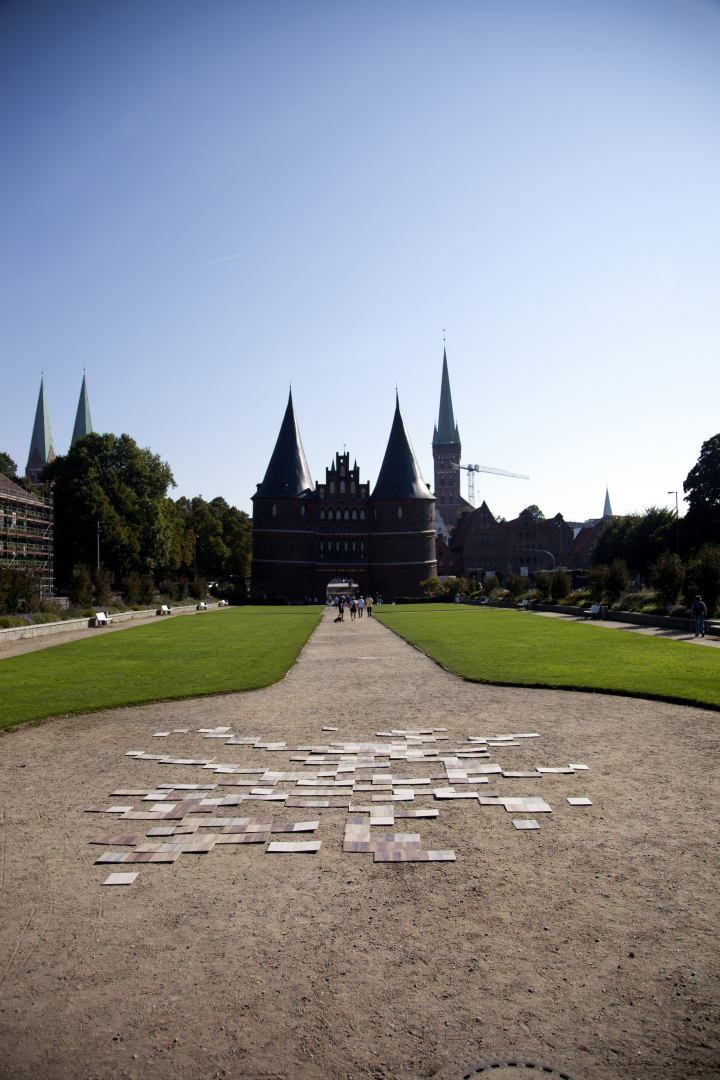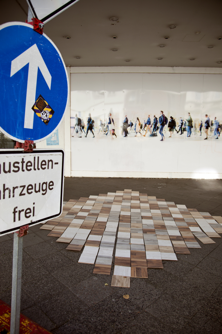 „Hymnen” | 2021, Intervention im öffentlichen Raum | Laminat, 300 Stück à 20 × 20 cm, 4 Farben