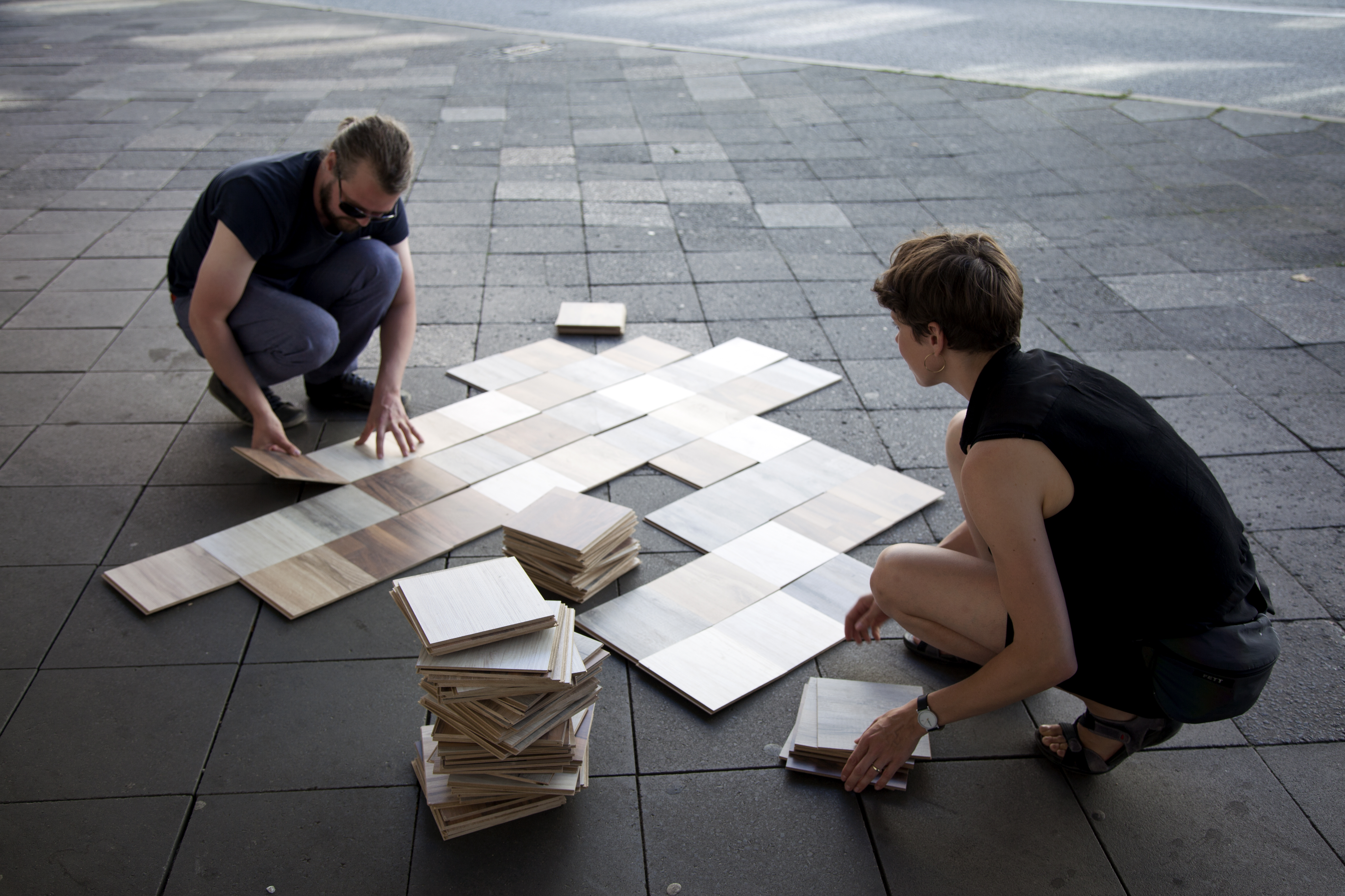 Die performative Installation des Laminat-Mosaiks im öffentlichen Raum nimmt Bezug zu bestehender Architektur. Dabei interessiert uns speziell das Zusammenspiel mit sakraler Architektur (Kirchen). Für das Muster greifen wir auf Elemente der Heraldik und religiöser Symbolik zurück.