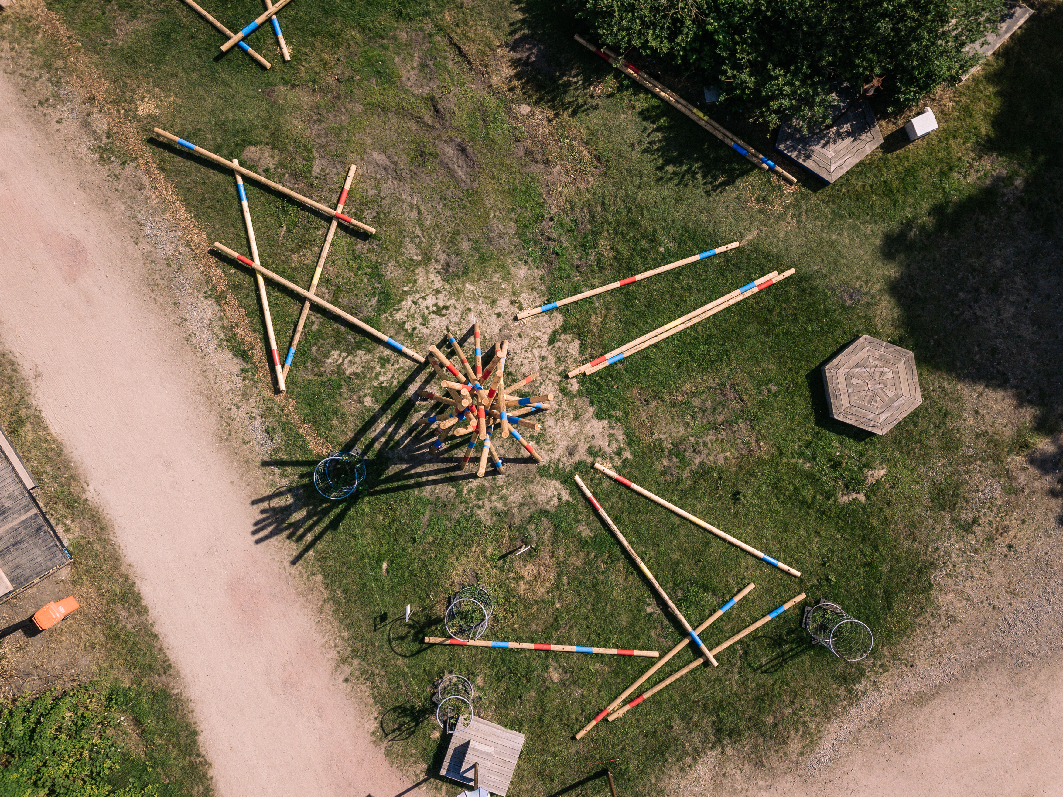 Ein riesiges Mikado-Spiel im freien Fall: Als „Freeze” fixiert die Installation den Moment des Spielbeginns.