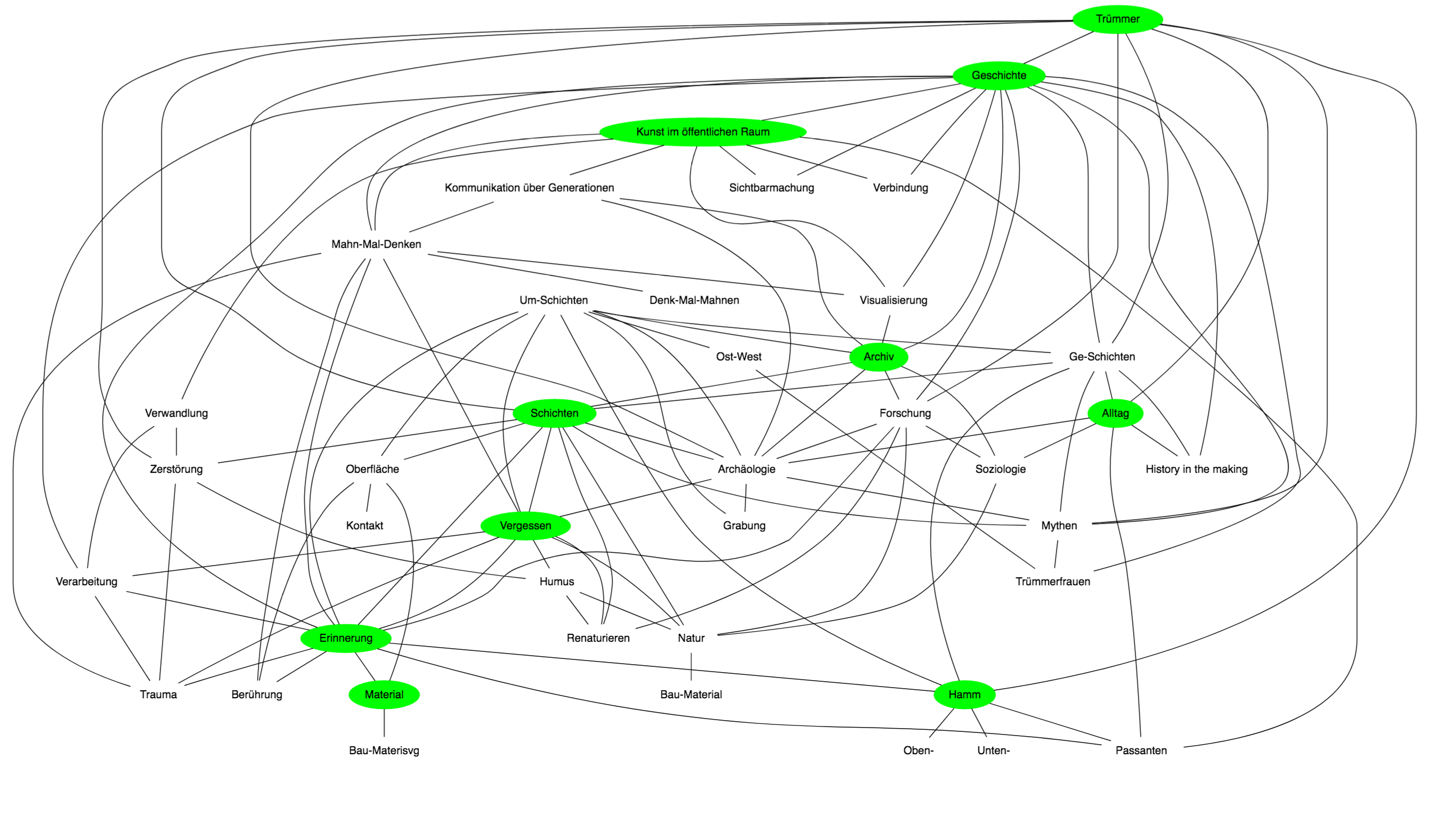 Die „Trümmer-Bank“ holt diese Spuren unserer Geschichte, über die buchstäblich Gras gewachsen ist, wieder hervor. Transformiert zum unbequemen Stachel, ruft sie in Erinnerung, was nie vergessen werden darf. Sie soll aber auch ein Appell sein, Geschichte nicht als etwas starres, allgemeingültiges und objektives zu sehen – vielmehr als fragile Konstruktion, welches in seiner Zeit verankert ist und stets neu gebildet werden muss, um damit Glorifizierung, Mythenbildung und Instrumentalisierung zu verhindern.