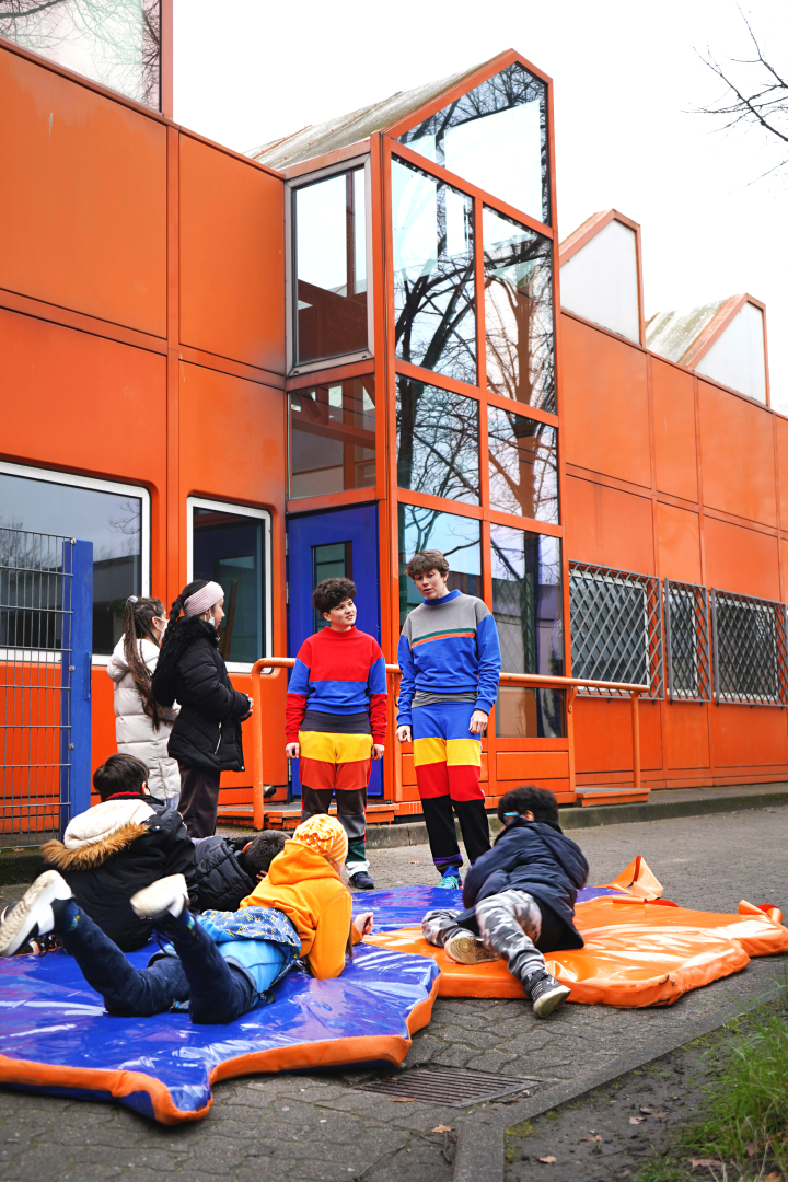 Vera Drebusch and Anne Reiter wear self-sewn jogging suits in different colors during their performance. Each individual color visualizes an answer to the survey, what does the west or the east look like? What color is East or West? The two artists use the unusual piece of clothing to talk to passers-by and schoolchildren at Mümmelmannsberg Stadtteilschule about the topic of East and West. In cooperation with art teacher Lino Gieseke.
