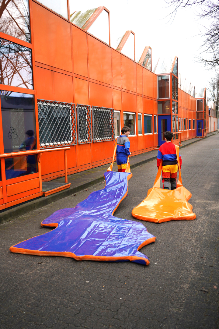 Vera Drebusch und Anne Reiter tragen während ihrer Performance selbstgenähte Jogging-Anzüge in verschiedenen Farben. Jede einzelne Farbe visualisiert dabei eine Antwort auf die Umfrage, wie sieht der Westen oder Osten aus? Welche Farbe hat der Osten oder der Westen? Die beiden Künstlerinnen nutzen das ungewöhnliche Kleidungsstück um mit Passant:innen und Schüler:innen ins Gespräch zu kommen über das Thema Ost und West. In Zusammenarbeit mit dem Kunstlehrer Lino Gieseke.