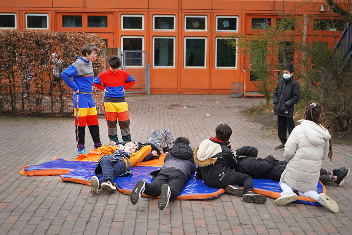 Vera Drebusch and Anne Reiter wear self-sewn jogging suits in different colors during their performance. Each individual color visualizes an answer to the survey, what does the west or the east look like? What color is East or West? The two artists use the unusual piece of clothing to talk to passers-by and schoolchildren at Mümmelmannsberg Stadtteilschule about the topic of East and West. In cooperation with art teacher Lino Gieseke.