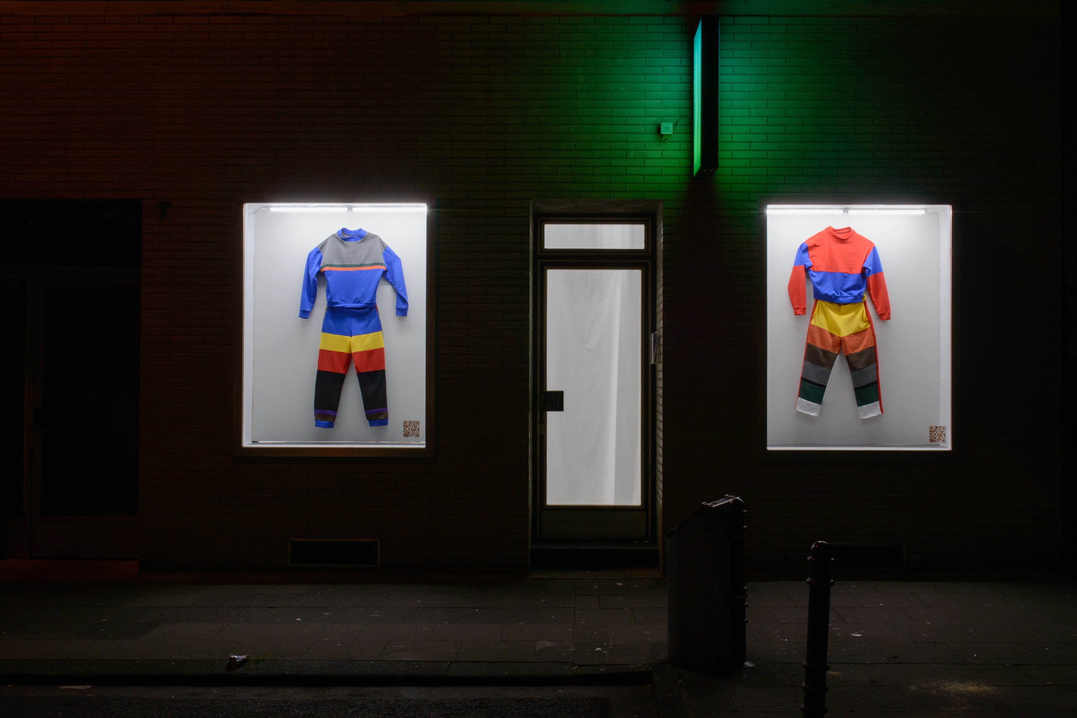 Vera Drebusch und Anne Reiter tragen während ihrer Performance selbstgenähte Jogging-Anzüge in verschiedenen Farben. Jede einzelne Farbe visualisiert dabei eine Antwort auf die Umfrage, wie sieht der Westen oder Osten aus? Welche Farbe hat der Osten oder der Westen? Die beiden Künstlerinnen nutzen das ungewöhnliche Kleidungsstück um mit Passant:innen und Schüler:innen ins Gespräch zu kommen über das Thema Ost und West. In Zusammenarbeit mit dem Kunstlehrer Lino Gieseke.