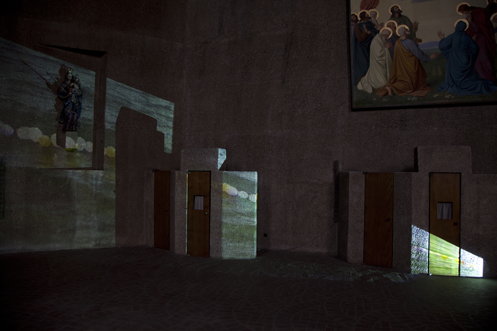 For this work various bodies of water were recorded using phone cameras of varying video quality. The resulting videos show the element of water in diverse geographic contexts (as a river, canal, sea, ice floe, spring, and fountain) and in different weather conditions. In a loop the movements dissolve into abstraction and form a regular, minimally changing, and ultimately recurring pattern. The interplay of the architecture and the video projections transform the static space into a flowing environment.