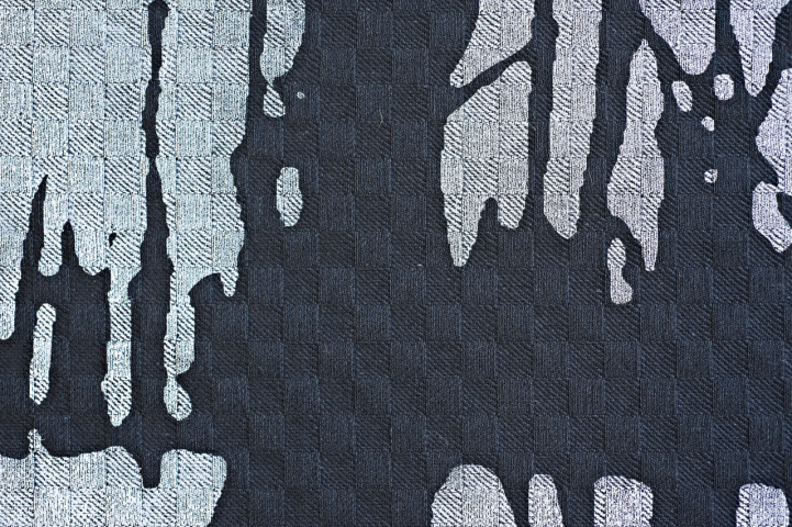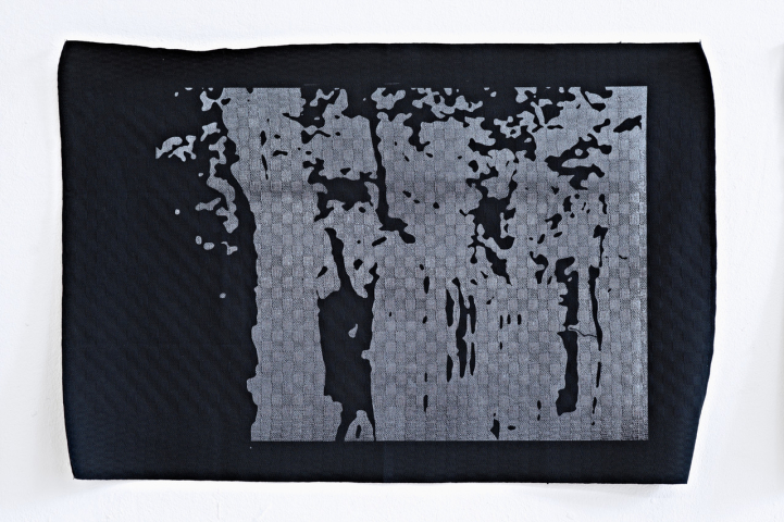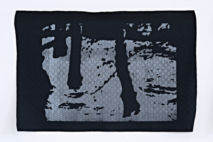 For this work, found photographs of floods were graphically reduced and transferred using screen printing onto miner’s towels. Miner’s towels are thickly woven cotton textiles, originally produced for mine workers, which they used to wrap their food or for keeping clean. Today these towels are especially popular as dish towels. The work was produced for an exhibition at Schloss Ringenberg—a moated castle in the Lower Rhein region, a historic center for the textile industry as well as for coal mining. Our perception today is increasingly desensitized to the motifs in the work—images of catastrophic states of exception—in two respects. On the one hand, with the ephemeral and ubiquitous flood of visuals today, photographic images lose their impact; on the other hand, in these times of climate change, the sight of alarming weather extremes is becoming all too familiar. Through a shift in the choice of image carrier and the connection of digital image and textile emerges however a subtle media-based disruption. Not only does the image become haptic and connect the crude materiality of the textile with the implicit wetness of the visuals, but the alienation of the image through reduction—like an optical illusion that appears to change between the real image and abstract impressions—also gives the starting image a formal beauty, linking the tragic with the aesthetic.