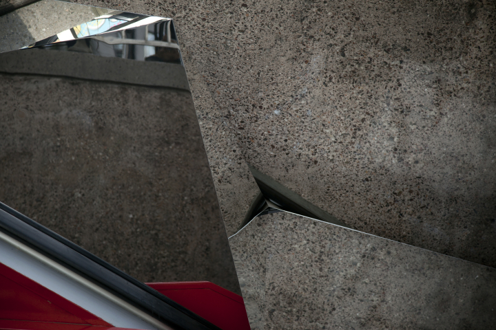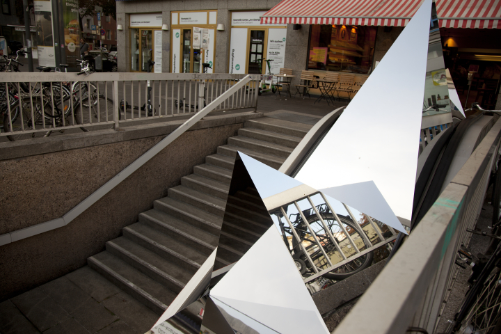 A pyramid-shaped structure with mirror surfaces winds its way down the escalator in an irregular offset with sharp edges. The pyramid surfaces catch sunlight through different angles and reflect it during the day in the underground of the passage. The sculpture becomes a kind of floating luminous body itself.