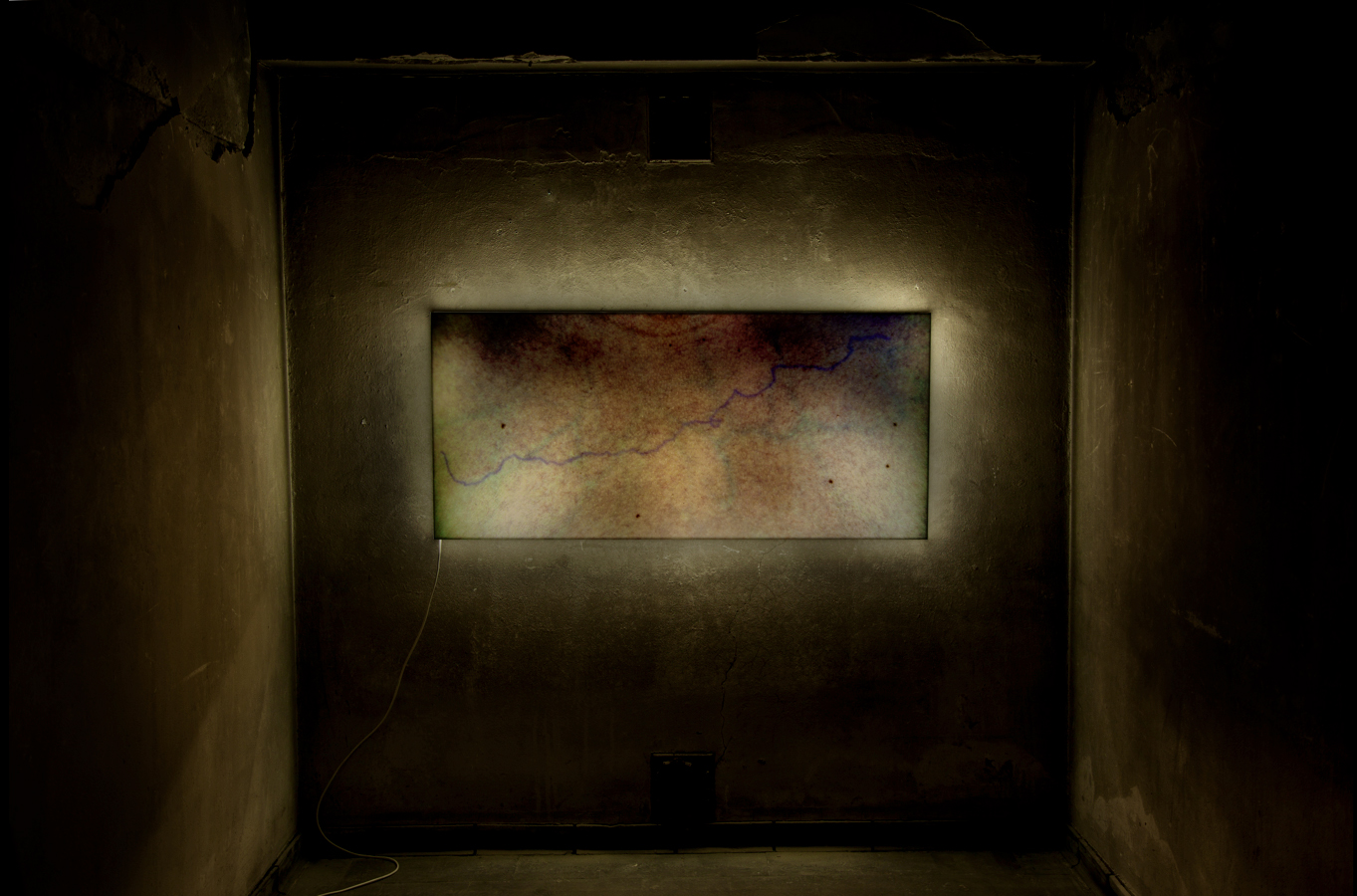 Die Arbeit wird als Fotografie in einem LED-Leuchtkasten präsentiert und verbindet zeitliche, geografische und künstlerische Abläufe zu einer vielschichtigen Gleichzeitigkeit von künstlerischen Übersetzungsprozessen. In ihr überblenden sich biografische,physische und mediale Einschreibungen und scheinen in der Fotografie konzeptuell und visuell durch, wie Adern durch die Haut, und das Bild durch die Projektionsfläche.“