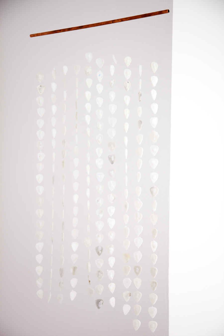 Aus 200 handgegossenen Wachs-Plektrons haben wir einen Vorhang angefertigt, der sowohl visuelle Verwandtschaft mit einer Notenschrift aufweist, als auch selbst – wie der singende Körper – in Bewegung ist.