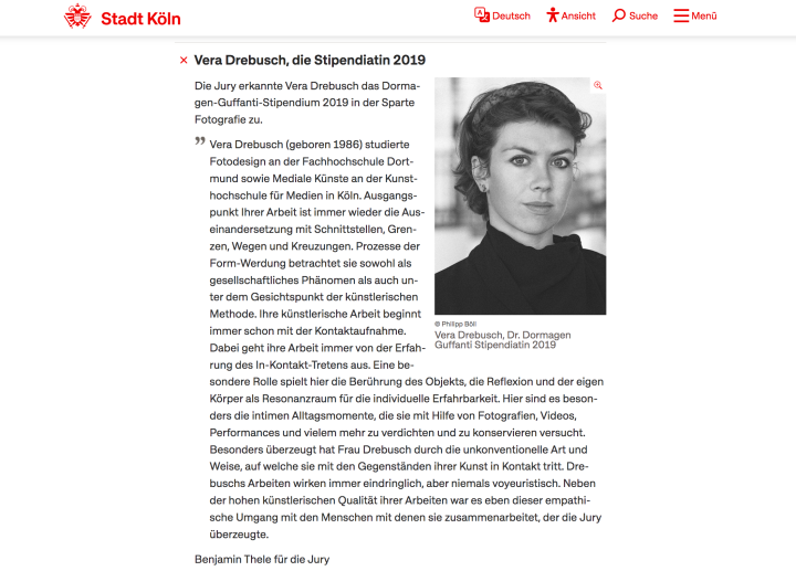 Besonders überzeugt hat Frau Drebusch durch die unkonventionelle Art und Weise, auf welche sie mit den Gegenständen ihrer Kunst in Kontakt tritt. Drebuschs Arbeiten wirken immer eindringlich, aber niemals voyeuristisch. Neben der hohen künstlerischen Qualität ihrer Arbeiten war es eben dieser empathische Umgang mit den Menschen mit denen sie zusammenarbeitet, der die Jury überzeugte.