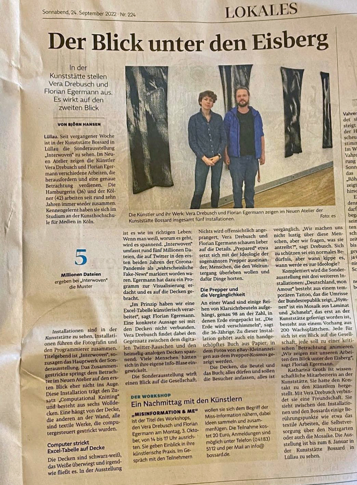 (…) Wirkungsvoll ist auch Vera Drebuschs ausgelegter Teppich namens “Enjoy the silence” in Grün- und Erdfarben bis zu hellen Tönungen. Ein Luftbild des Militärgeländes Munster ist Basis für die gewebte Kunst. (…) Drebusch hängt fünf Kissen an die Wand mit öliger Plastikbeschichtung. Wirkt mit gewissem Abstand kuschelig mit seiner Kissenfüllung, aber aus der Nähe schmierig. Der Eindruck täuscht nicht. Aufgedruckt sind Fotoausschnitte vom Meer nach dem katastrophalen Ölunfall der Bohrplattform Deep Horizon im Jahre 2010 im Golf von Mexiko.