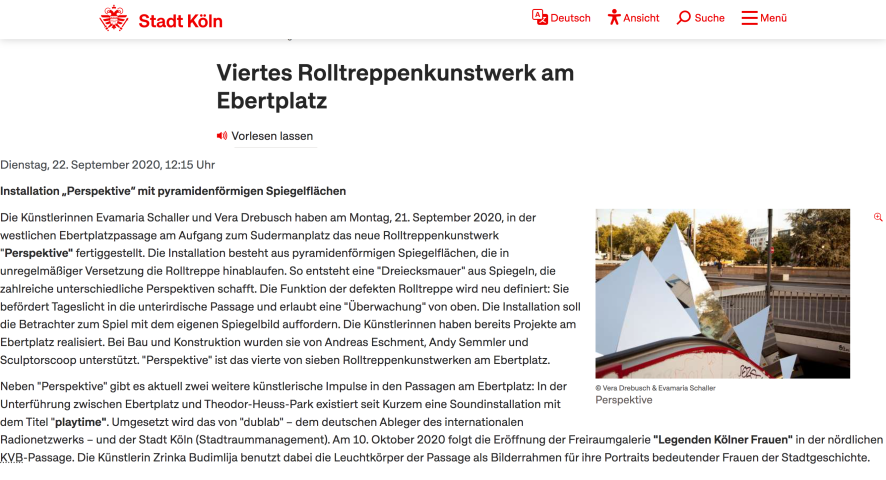 Die Künstlerinnen Evamaria Schaller und Vera Drebusch haben am Montag, 21. September 2020, in der westlichen Ebertplatzpassage am Aufgang zum Sudermanplatz das neue Rolltreppenkunstwerk “Perspektive” fertiggestellt. Die Installation besteht aus pyramidenförmigen Spiegelflächen, die in unregelmäßiger Versetzung die Rolltreppe hinablaufen. So entsteht eine “Dreiecksmauer” aus Spiegeln, die zahlreiche unterschiedliche Perspektiven schafft. Die Funktion der defekten Rolltreppe wird neu definiert: Sie befördert Tageslicht in die unterirdische Passage und erlaubt eine “Überwachung” von oben. Die Installation soll die Betrachter zum Spiel mit dem eigenen Spiegelbild auffordern. Die Künstlerinnen haben bereits Projekte am Ebertplatz realisiert. Bei Bau und Konstruktion wurden sie von Andreas Eschment, Andy Semmler und Sculptorscoop unterstützt. “Perspektive” ist das vierte von sieben Rolltreppenkunstwerken am Ebertplatz.